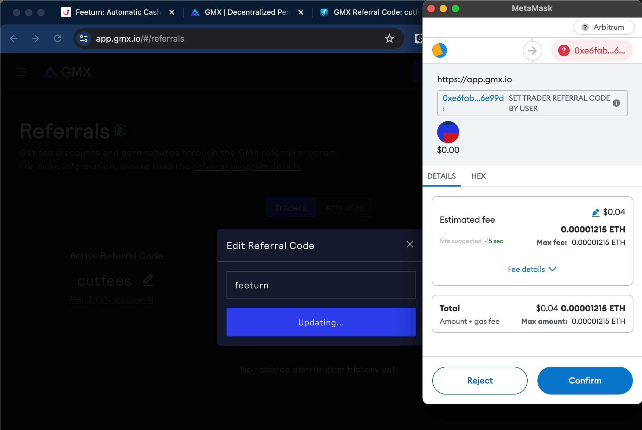 4. 지갑 승인 후 조금만 기다리시면 **추천인 ID가 Feeturn으로 변경**된 것을 확인하실 수 있습니다. 그러면 이제부터 **이 지갑으로 GMX에서 거래**하실 경우 Feeturn에서 **수수료 자동 환급**이 시작됩니다.