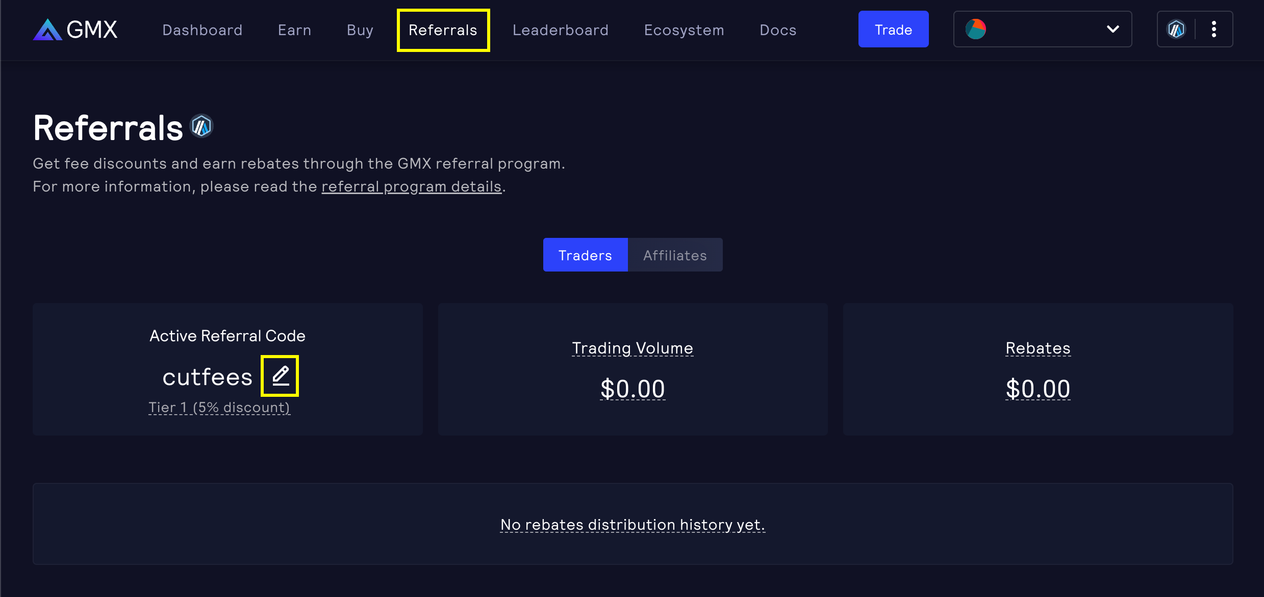 1. GMX 거래소에 접속하여 **\[Referrals]** 메뉴를 선택하시면 **현재 적용된 추천인 코드**가 표시됩니다. 이 코드가 '**feeturn**'이어야 올바르게 적용된 것입니다. 그러나 아래 그림과 같이 다른 코드가 이미 적용되어 있다면, 코드 우측에 있는 **연필 아이콘을 클릭**하세요.
