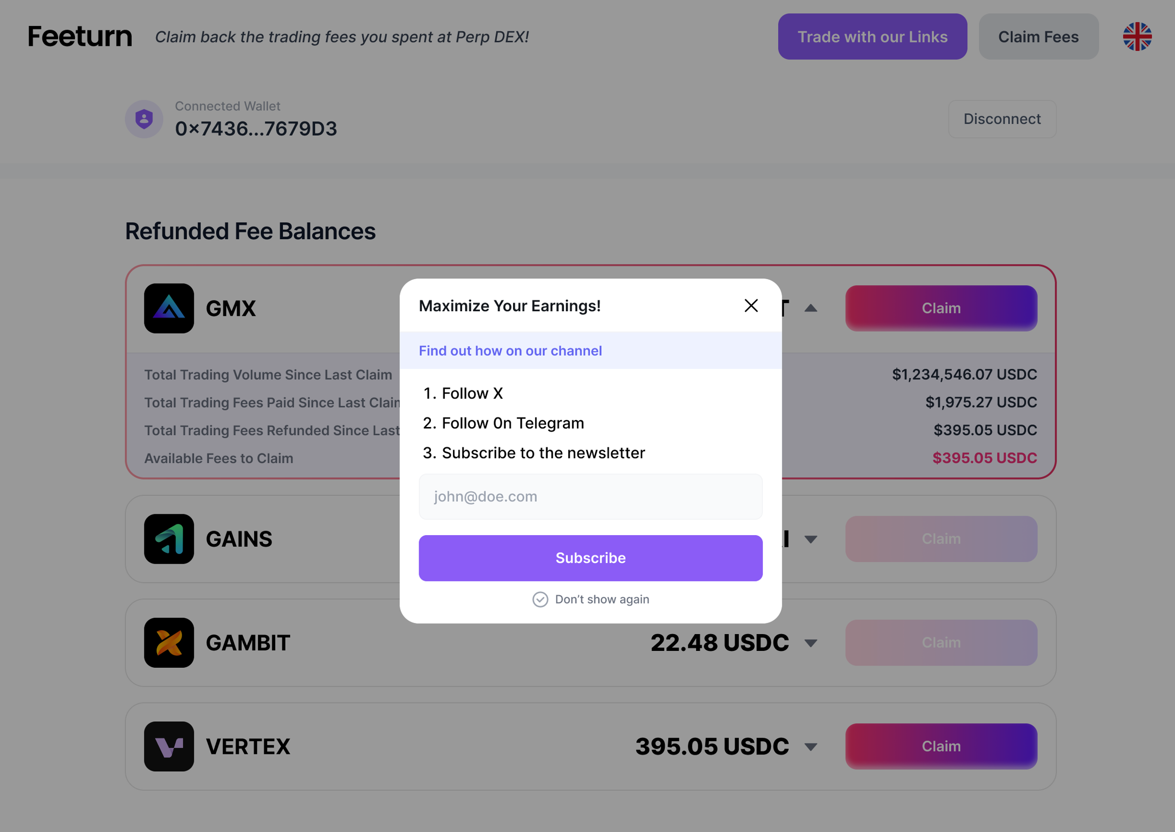 Feeturn은 지원하는 모든 DeFi 거래소에서의 거래를 24시간 모니터링해 환급금을 자동으로 적립해 드려요. 여러분이 하실 일은 오직 지갑을 연결해 청구하시는 것 뿐입니다. 참 쉽죠?