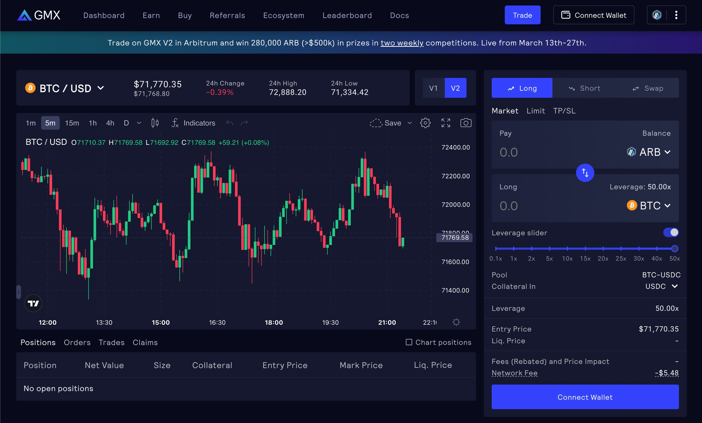 1. Feeturn에서 GMX 거래소 배너 아래에 있는 '지금 거래하고 환급받으세요!' 버튼을 눌러 GMX 거래소로 이동합니다.