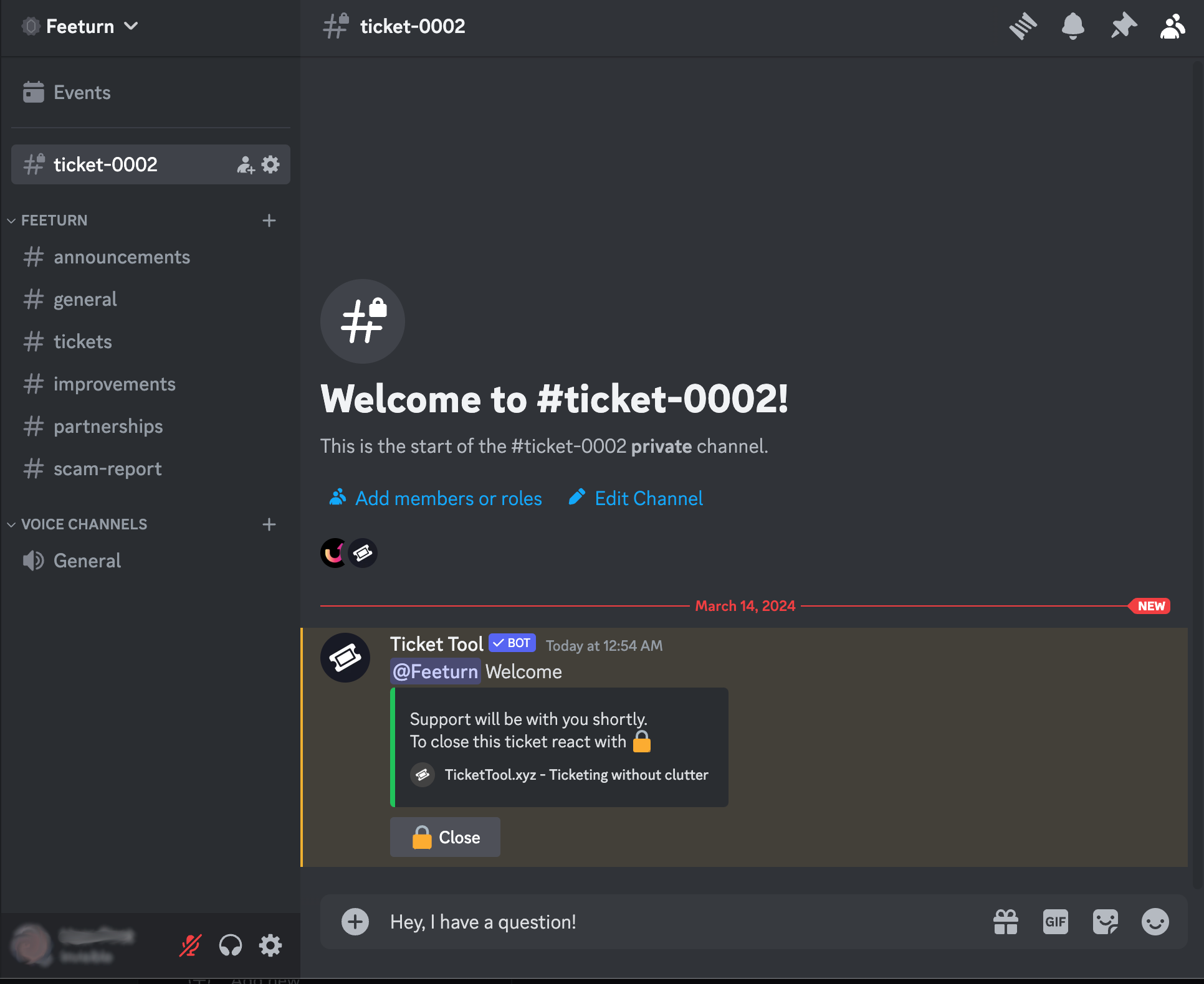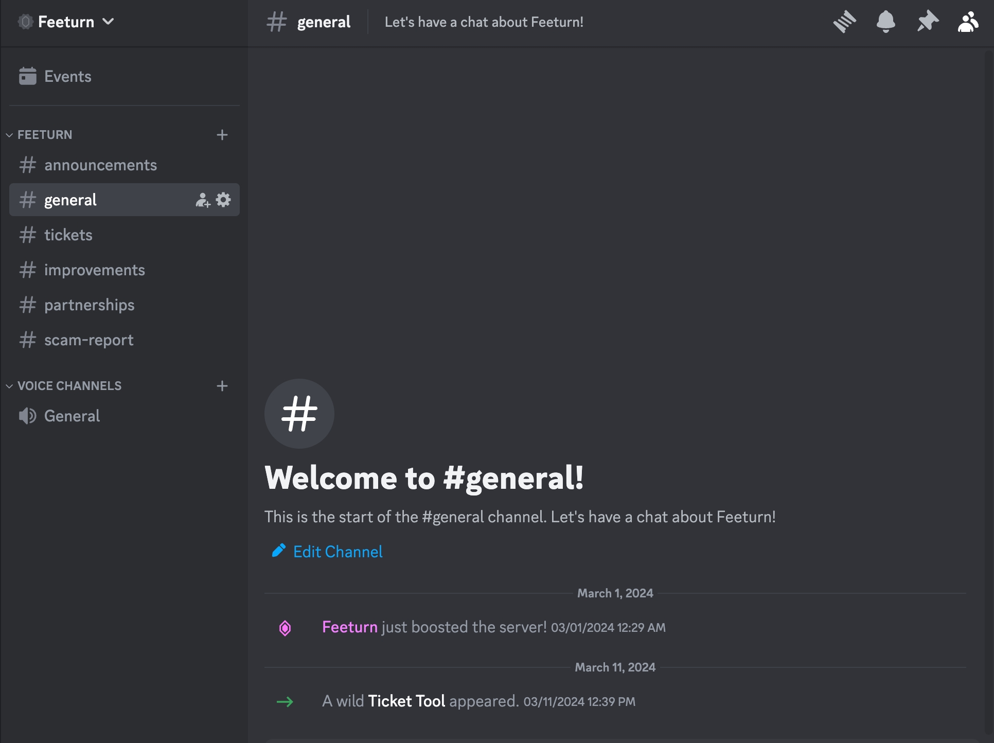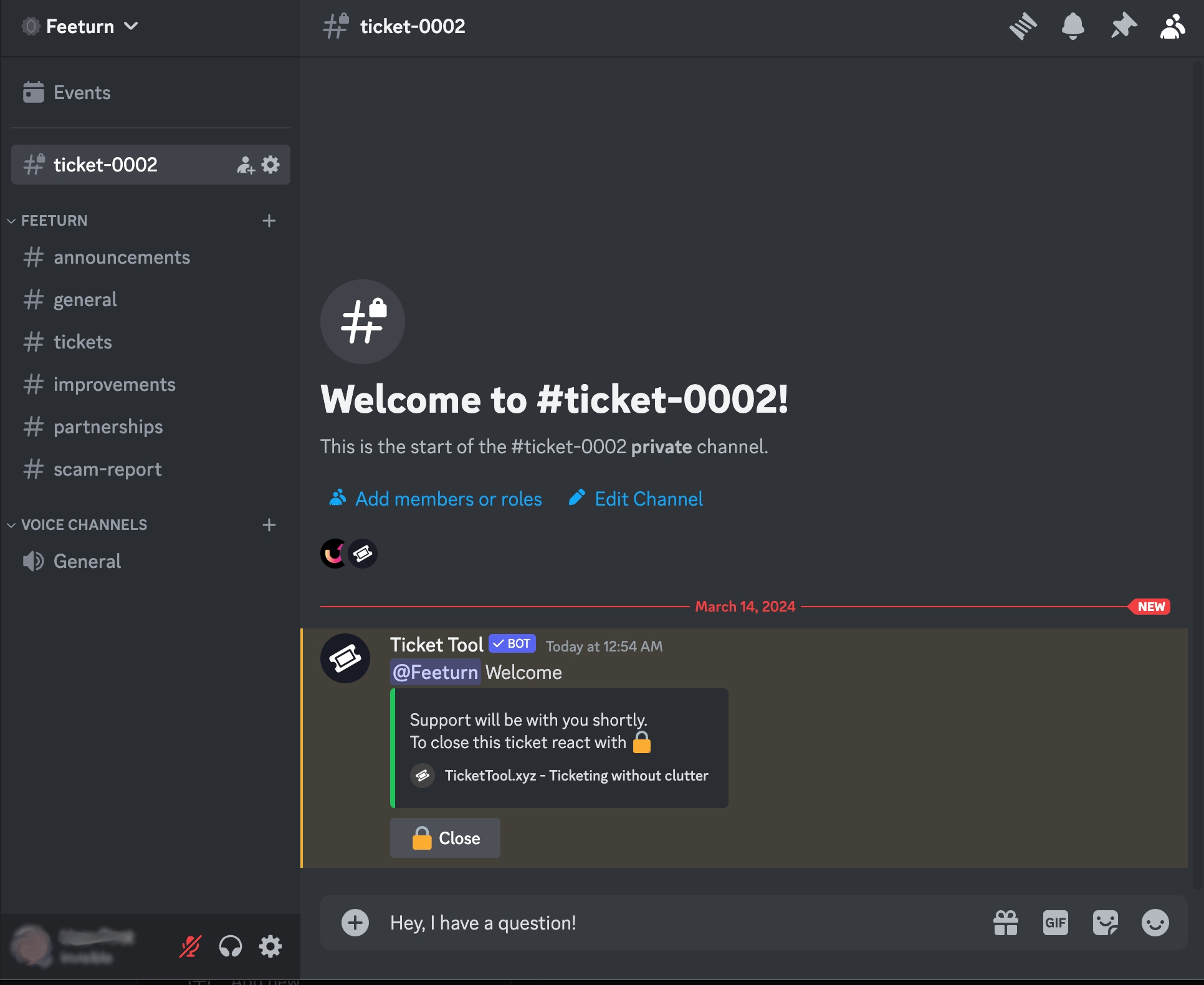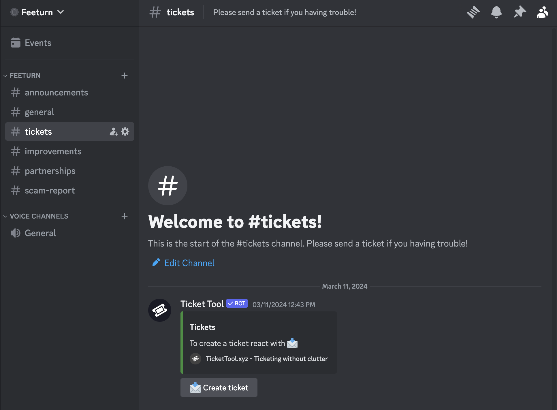 디스코드 Feeturn 서버에 가입하셨으면 #tickets 채널을 찾은 후 'Create ticket' 버튼을 클릭하세요.